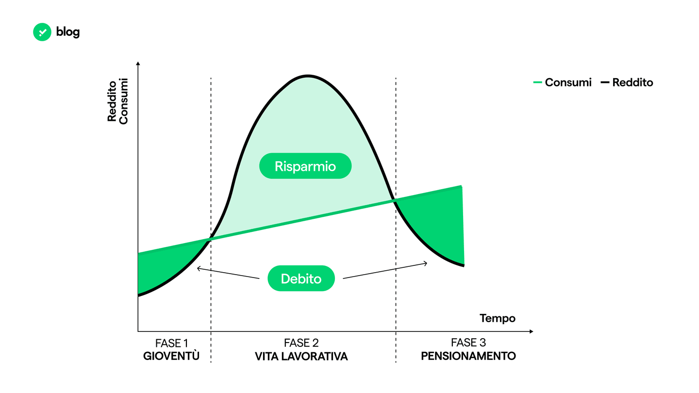 - Fase di decumulo: coincide con il ritiro dal lavoro, periodo in cui il reddito da pensione sostituisce solo in parte quello da lavoro. In questa fase, l’individuo attinge ai risparmi accumulati, utilizzandoli in modo strategico per mantenere costante il livello dei consumi e garantire stabilità economica, in linea con l’obiettivo della teoria.